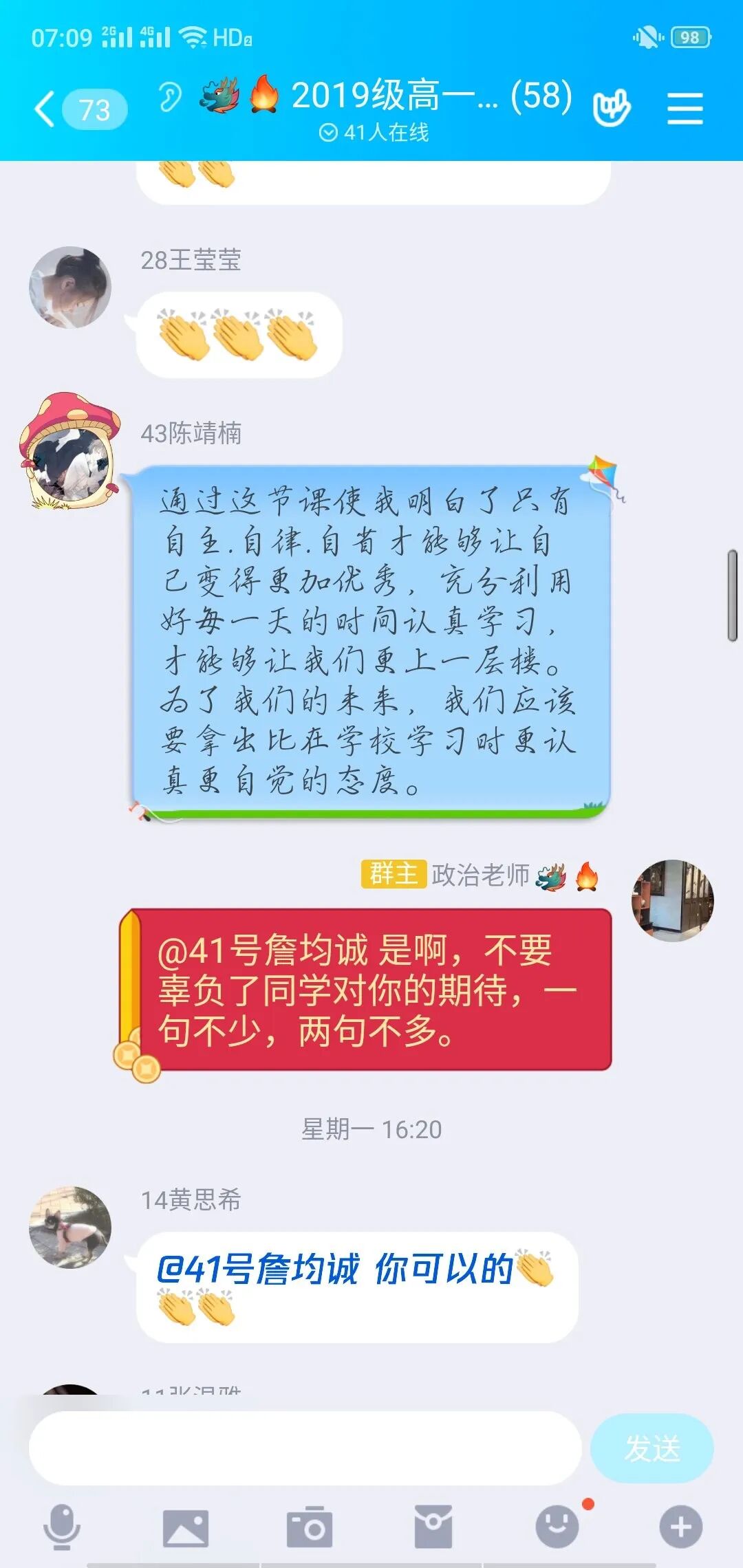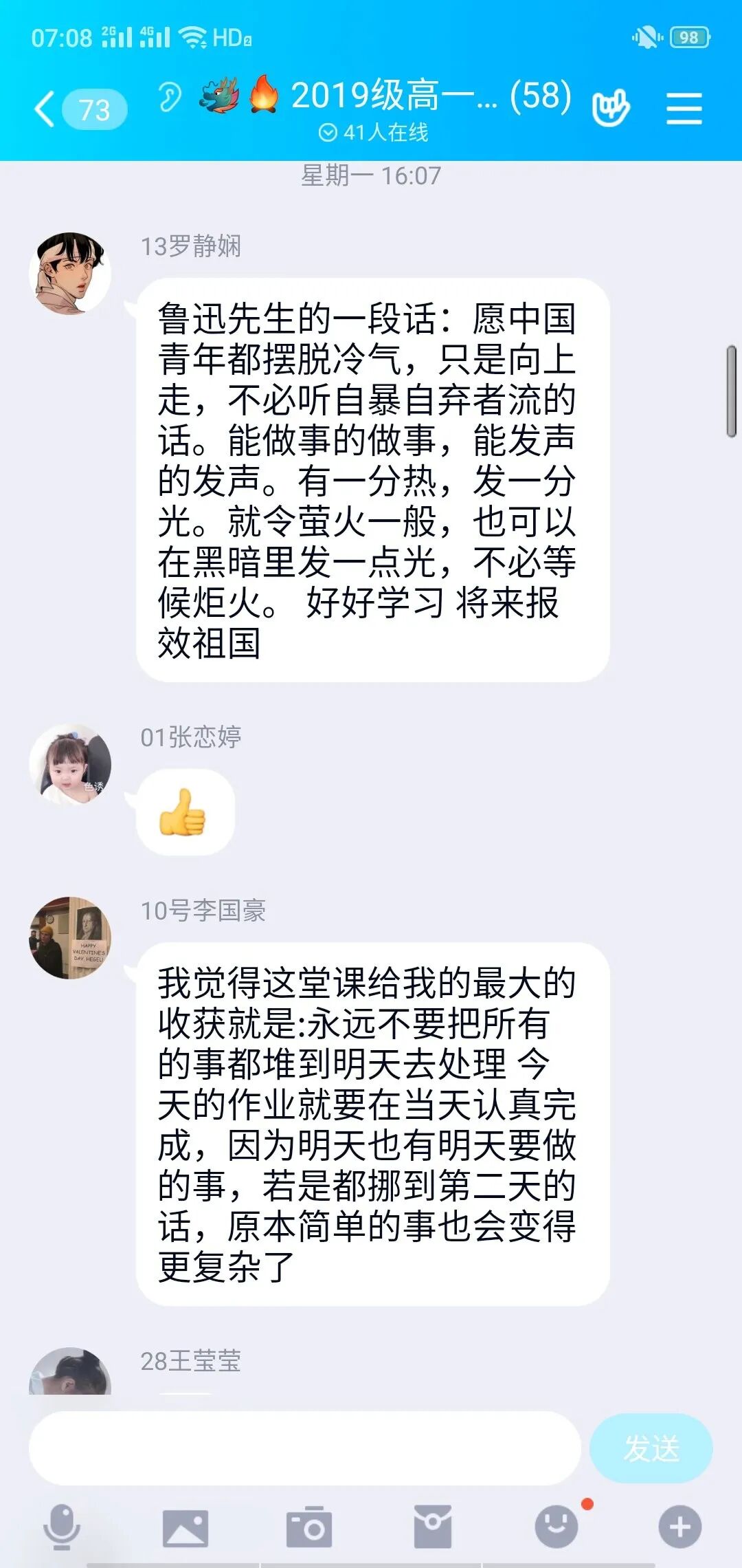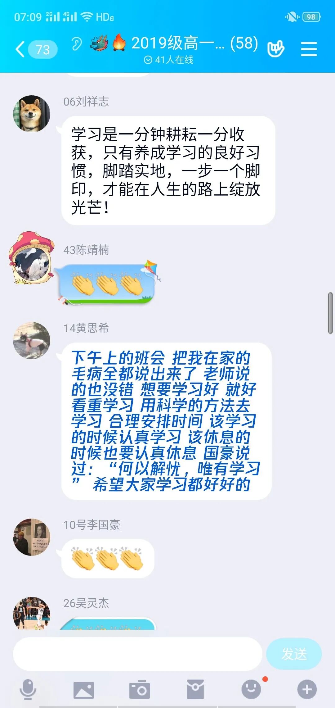 “疫情须防范,学习不能放”,此时此刻,谁更懂得自主、自律、自省地学习,谁就能取得更大的收获。为此,2020年3月2日下午,我校2019级高一年段开展了以“自主、自律、自省”为主题的第一次线上班会。